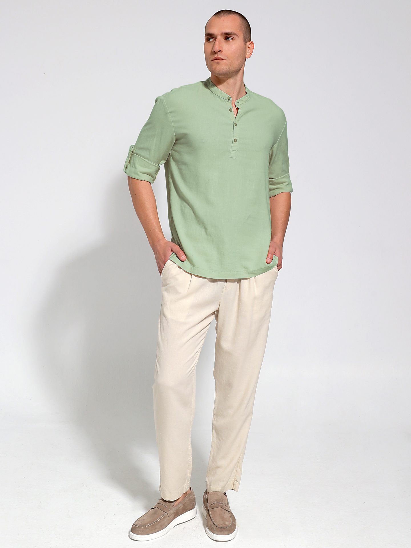 Μια μακριμάνικη ανδρική πουκαμίσα από λινό ύφασμα είναι ιδανική για τις ζεστές μέρες του καλοκαιριού, προσφέροντας άνεση και στυλ. Το λινό, γνωστό για την αναπνεύσιμη και φυσική του υφή, δίνει μια αίσθηση δροσιάς, καθώς επιτρέπει στον αέρα να κυκλοφορεί ελεύθερα.