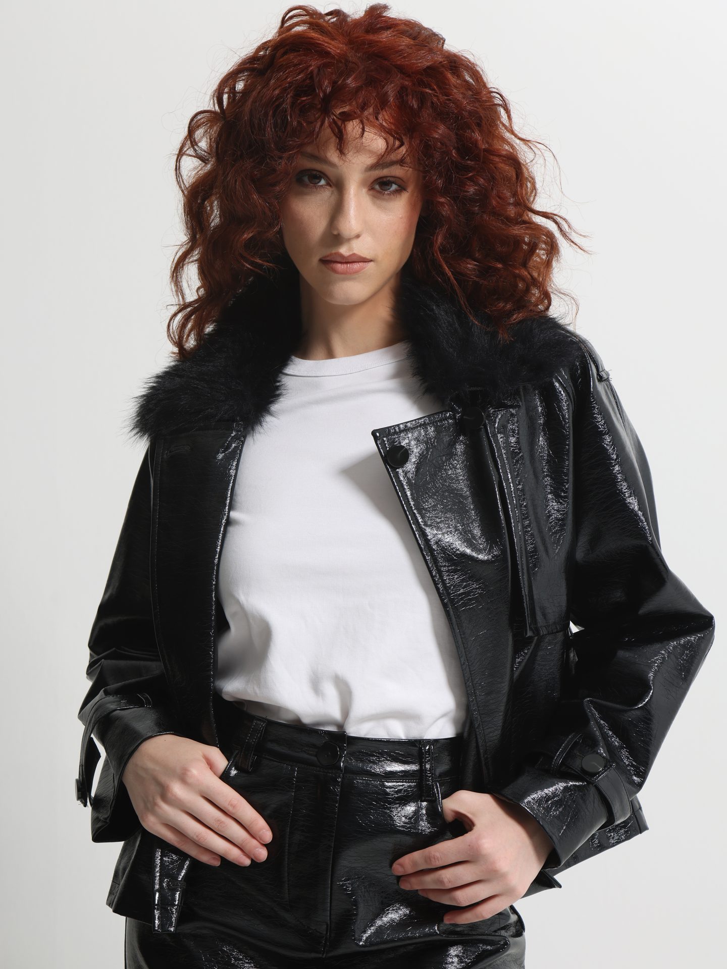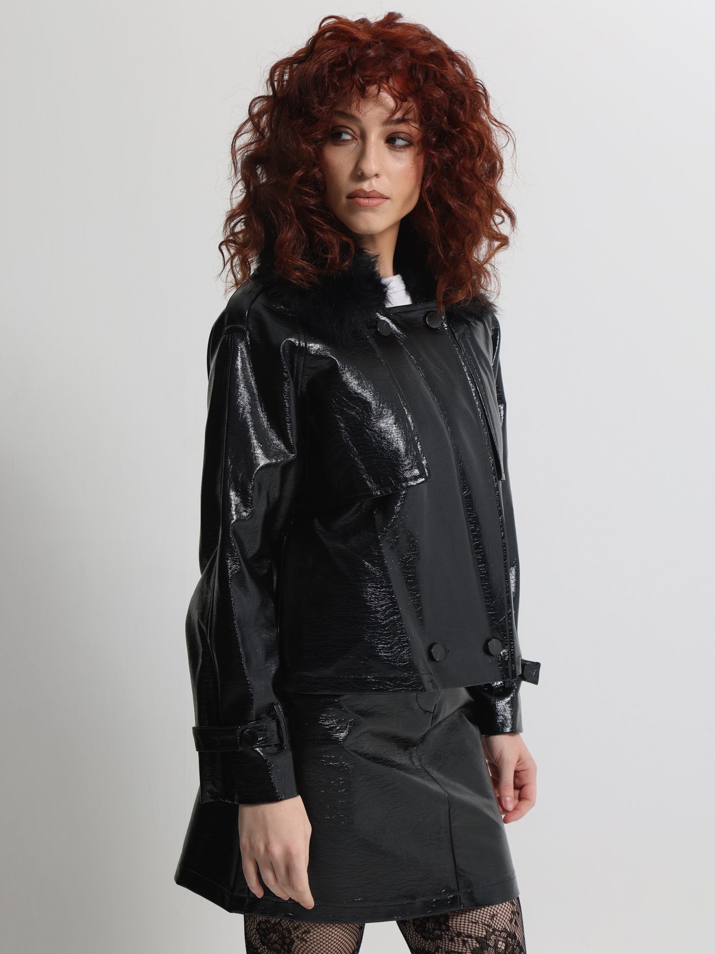Γυναικείο Vinyl Μπουφάν με Γούνινο Γιακά ALICE 8713 Μαύρο