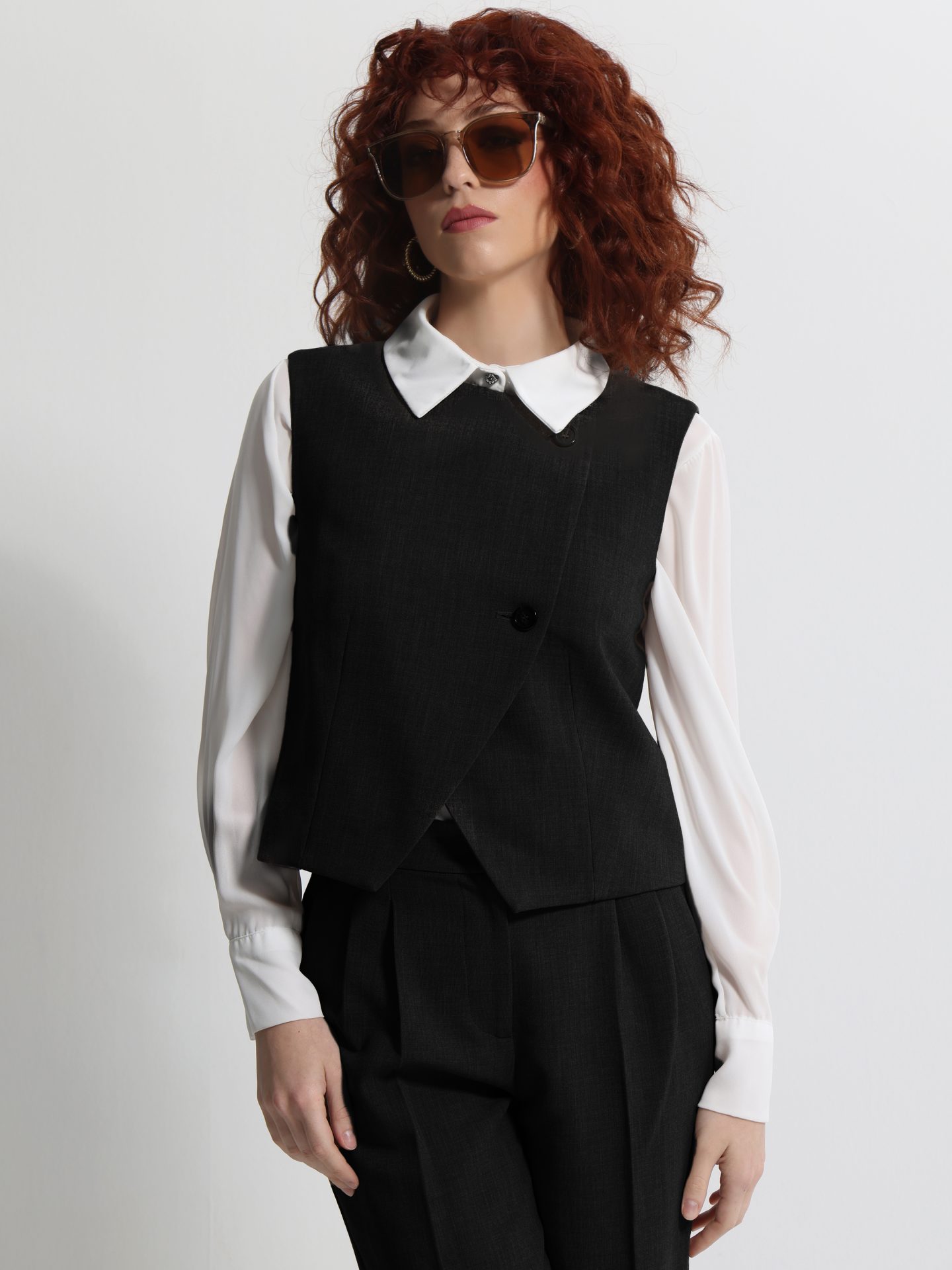 Με μια αέρινη ισορροπία ανάμεσα στο minimal design και το σύγχρονο tailoring, το γυναικείο ασύμμετρο γιλέκο με δύο κουμπιά αναδεικνύεται σε must-have κομμάτι της σεζόν. Η ταμπά απόχρωση του υφάσματος αποπνέει διακριτική πολυτέλεια, ενώ η ασυμμετρία στη γραμμή χαρίζει μια avant-garde διάσταση στο look σου. Είναι το είδος του κομματιού που δεν περνά απαρατήρητο, αλλά αντίθετα γίνεται το κέντρο της στιλιστικής αφήγησης.