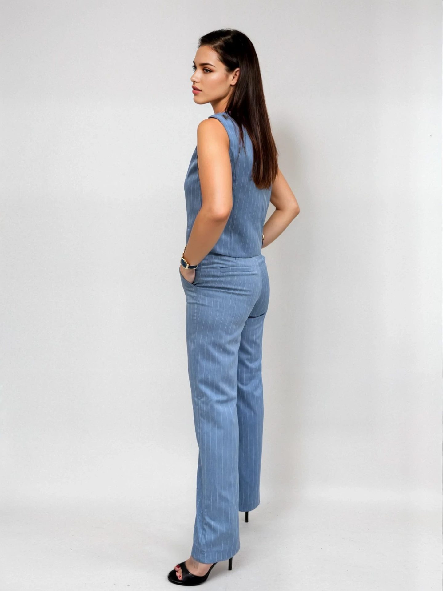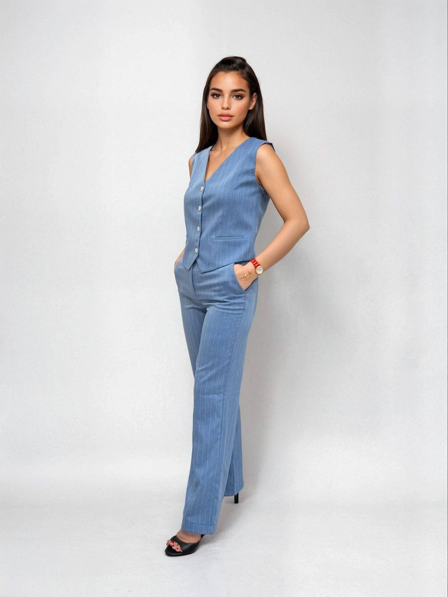 Το γυναικείο γιλέκο αποτελεί ένα απαραίτητο κομμάτι για κάθε γκαρνταρόμπα, συνδυάζοντας στυλ και λειτουργικότητα. Κλείνει με κουμπάκια μπροστά και διαθέτει κρυφές τσέπες, προσφέροντας πρακτικότητα χωρίς να θυσιάζει την κομψότητα. Ο σφιγκτήρας στο πίσω μέρος προσθέτει μια μοντέρνα πινελιά, κάνοντάς το ιδανικό για κάθε περίσταση.